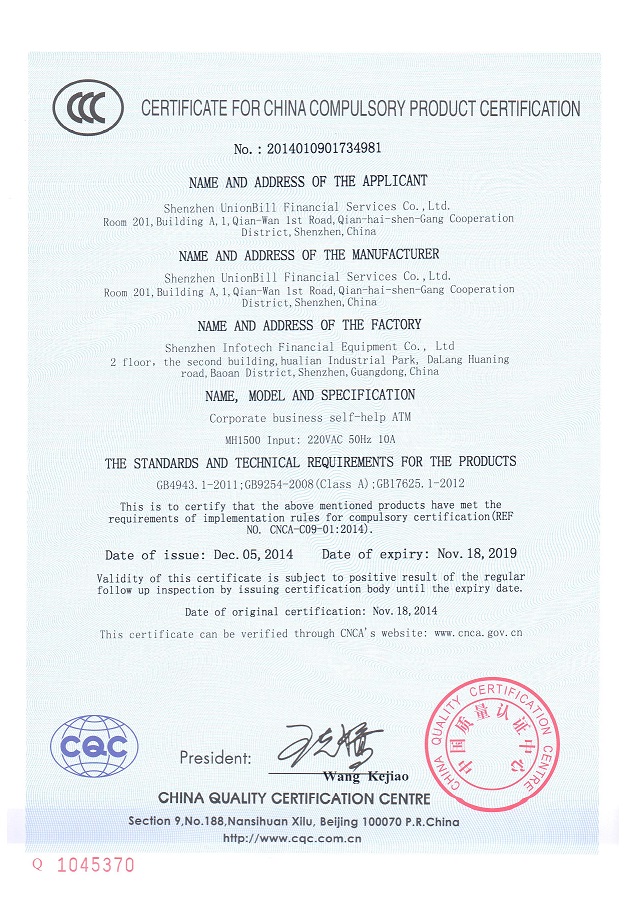 2014年9月,票联金融公司“票据自助柜员机”顺利通过3C认证。在产品认证审核期间,中国质量认证中心对“票据自助柜员机”进行各项检测,并审核公司质量管理体系的运行情况,认为“票据自助柜员机”满足技术、质量、生产等各项要求,符合3C认证标准。