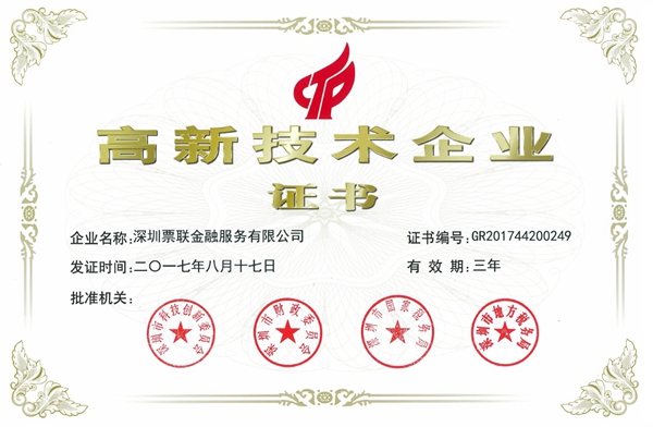 近日,高新技术企业认定管理工作网公布了深圳市2017年第一批国家高新技术企业名单,深圳票联金融服务有限公司榜上有名。