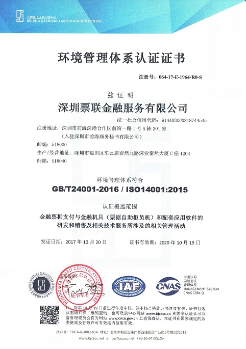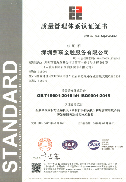 近期,深圳票联金融服务有限公司获得IAF和CNAS两家机构颁发的管理体系认证证书,正式通过ISO9001:2015国际质量管理体系认证、ISO14001:2015环境管理体系认证和OHSAS18001:2007职业健康安全管理体系认证。
