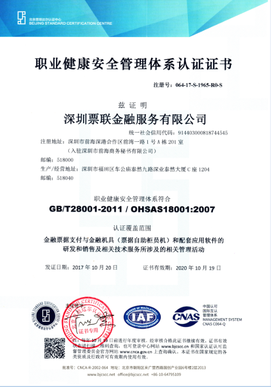 近期,深圳票联金融服务有限公司获得IAF和CNAS两家机构颁发的管理体系认证证书,正式通过ISO9001:2015国际质量管理体系认证、ISO14001:2015环境管理体系认证和OHSAS18001:2007职业健康安全管理体系认证。