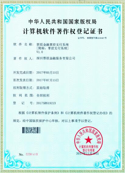 近期,由我司自主研发的《票联金融聚合支付平台V1.0》和《票联金融掌控支付系统V1.0》两项系统软件经中华人民共和国国家版权局审核,均取得国家版权局颁发的软件著作权登记证书。截至目前,我司已拥有15项软件著作权登记证书,其版权将得到“中国版权保护中心”的有效保护。